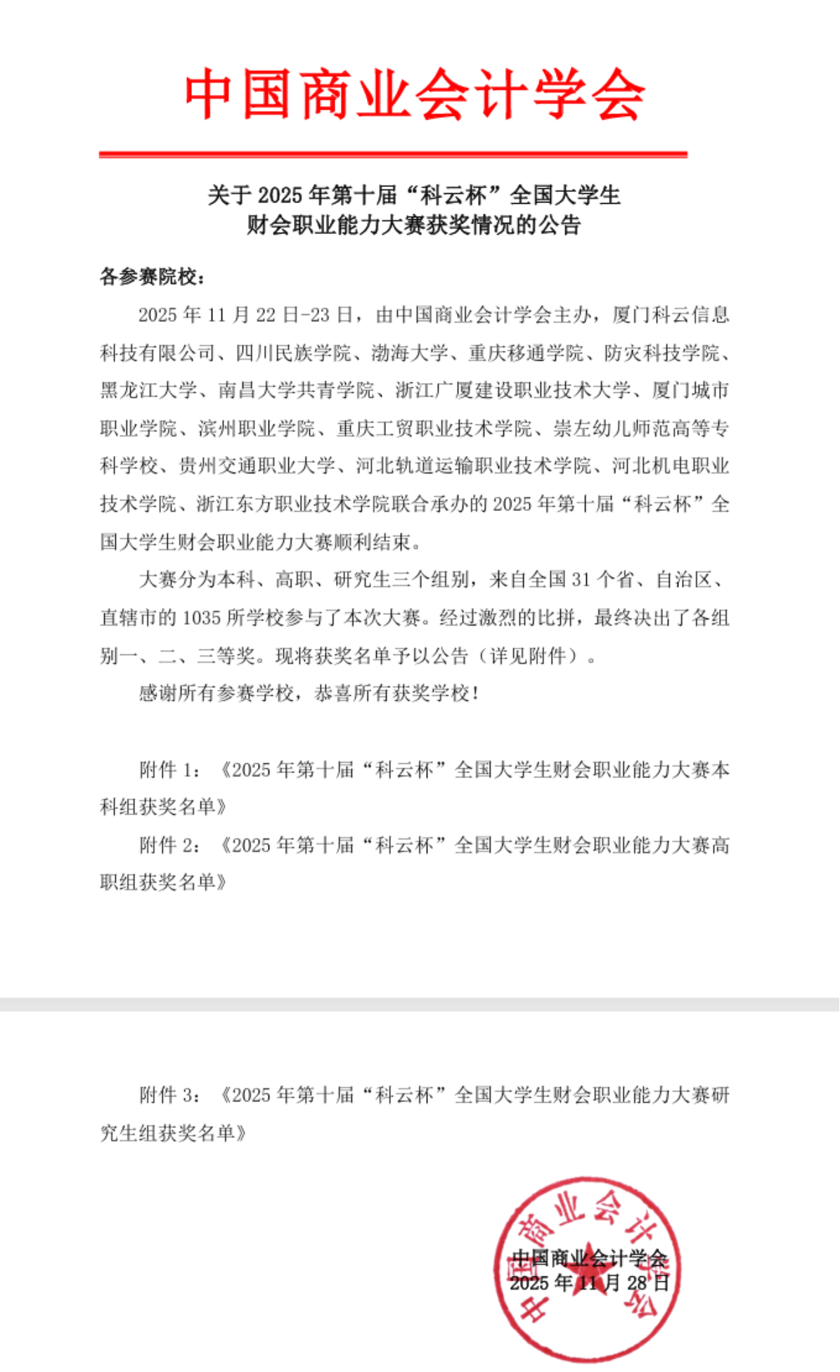 近日,由中国商业会计学会主办的全国性权威赛事,“2025年第十届科云杯全国大学生财会职业能力大赛”顺利结束,会计学院本科生与研究生代表队双双告捷,凭借出色的数智化财会职业能力在两赛道取得优异成绩。研究生组参赛队伍中,刘晶晶、汪洁、刘紫晔、刘思辰团队,张梦洁、张喜悦、李妍昕、郝叶桐团队分别获得全国二等奖。本科生组参赛队伍中,尼靖雯、师润昕、叶文静、刘昕玥团队,张雨阳、郝乐、薛凝、陈瑜团队分别获得北京市三等奖。