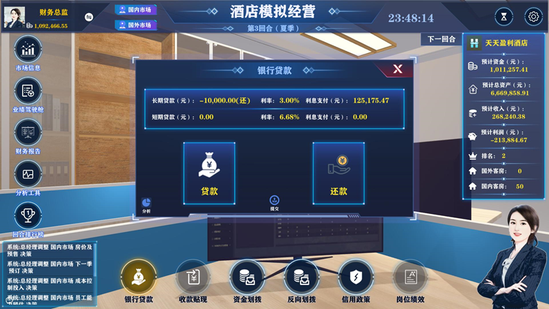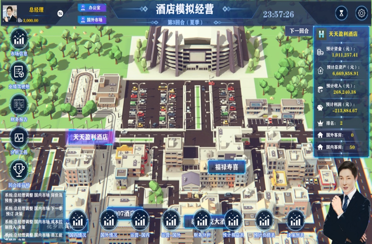 该课程直面传统商科教育中“理论与实践脱离”、“业务与财务分割”的痛点,利用虚拟仿真、数智化与沙盘模拟技术,构建了一个高仿真的酒店集团运营环境。在虚拟仿真平台上,学生将组建管理团队,分别扮演酒店总经理、财务总监、销售总监、运营总监等核心角色,直面市场竞争,基于动态变化的市场数据、财务报表和运营指标,进行全方位的企业经营管理决策,包括战略定位、投资融资、预算编制、价格制定、营销推广、成本控制等。这一课程旨在模拟真实商业世界的复杂性与不确定性,培养学生运用所学专业知识分析解决企业决策和财务管理问题的实践能力和创新思维。
